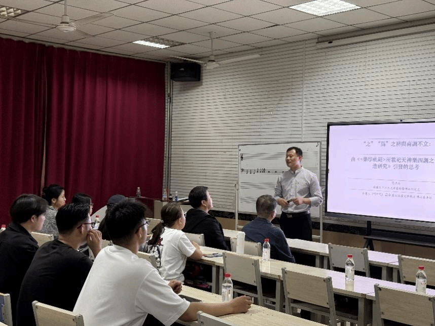 多媒体教室成功举办。范洪涛老师以《“之”“为”之辨与商调不立》为题,透过韩国学者南相淑教授的《〈乐学轨范〉所载祀天神乐四调之音构造研究》,在文献思辨的基础上考察了日本、中国、韩国学者关于“之调式”“为调式”的历史研究。