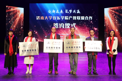 捐赠教育基金;济南大学为山东演出公司授牌,建立济南大学就业实习基地;为山东剧院、山东演出公司、洛杉矶教学研究中心授牌,建立济南大学实践教学基地,拉开了产教联盟合作的序幕。