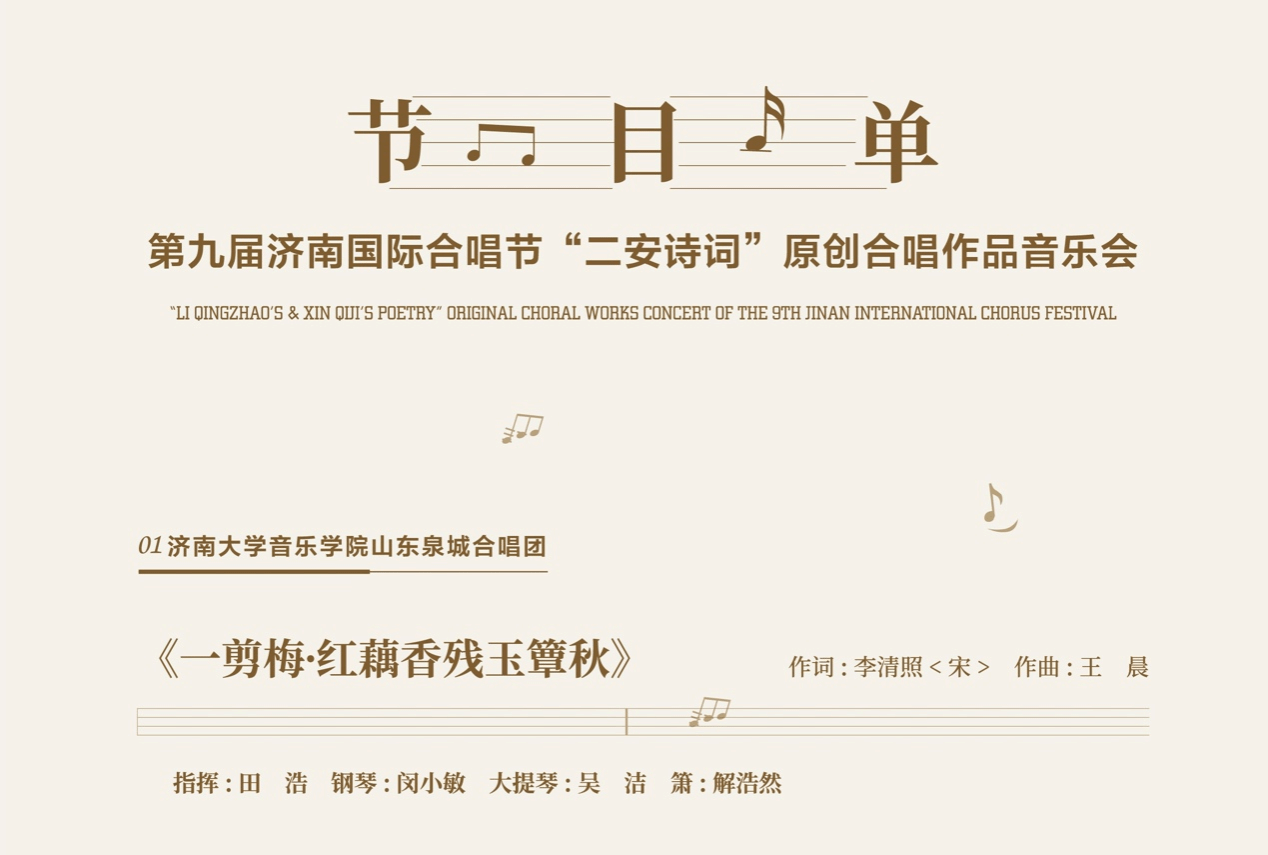 在此次合唱节中,太阳城网络赌博平台青年教师田浩老师指挥、闵小敏老师担任艺术指导,同时在解浩然同学的助演下,合唱团完美演绎了由王晨作曲的《一剪梅·红藕香残玉簟秋》,这是李清照新婚燕尔思念丈夫赵明诚写下的一首词,婉转含蓄,唯美隽永。全词以花喻人,一气呵成,将瞬间情绪付诸笔端,展现易安词独特之美。