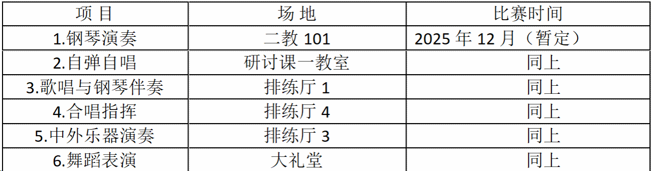 备注:单项比赛分为:钢琴演奏、声乐演唱、钢琴伴奏、自弹自唱、合唱指挥、中外乐器演奏、舞蹈表演共七大项目。参赛范围如下: