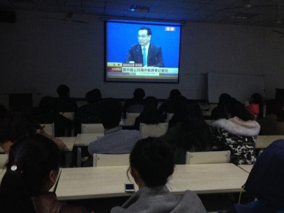 学生会组织学生干部、团支部成员在学院多媒体教室观看“李克强总理答记者问”视频录像。